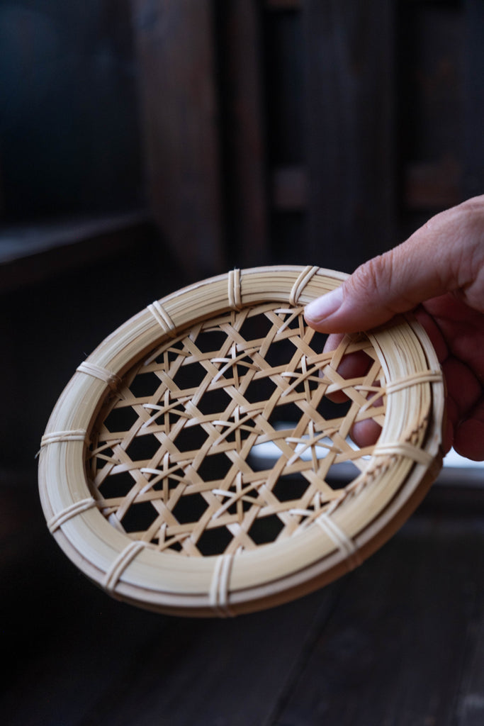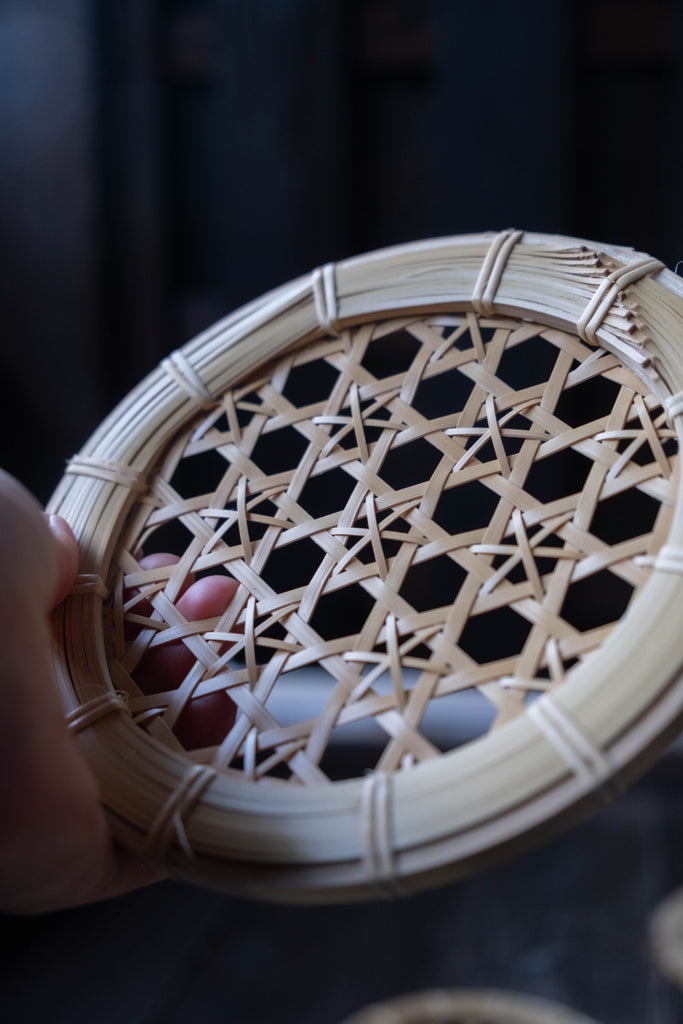 清々しい白竹を六つ目編みに細いひご編み込んで仕上がる素敵なざる